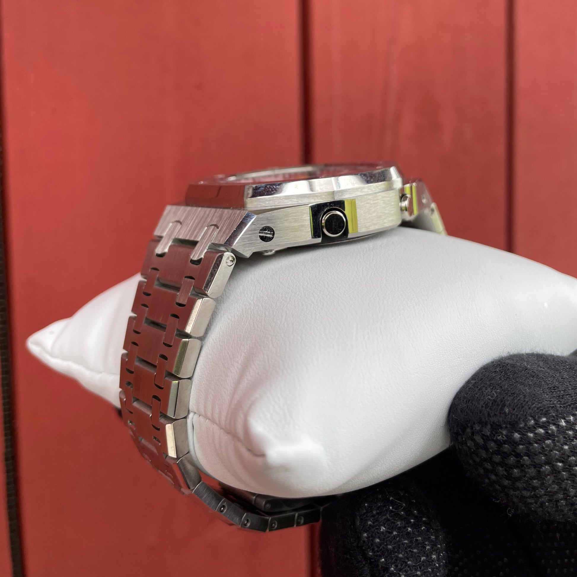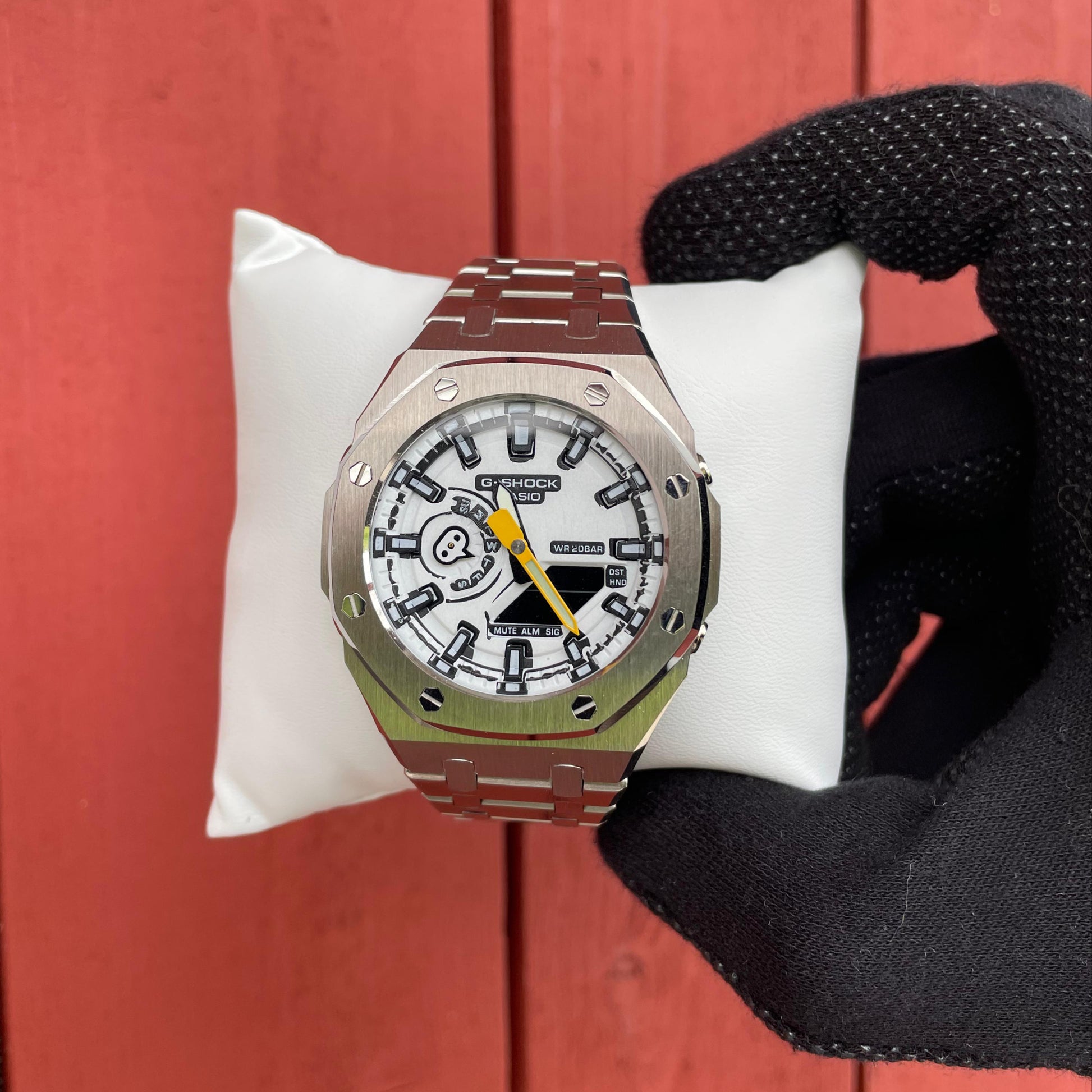 Durability meets style. This customized G-Shock blends tough performance with a refined metal finish and elegant crystal details, making it perfect for both everyday wear and standout moments.