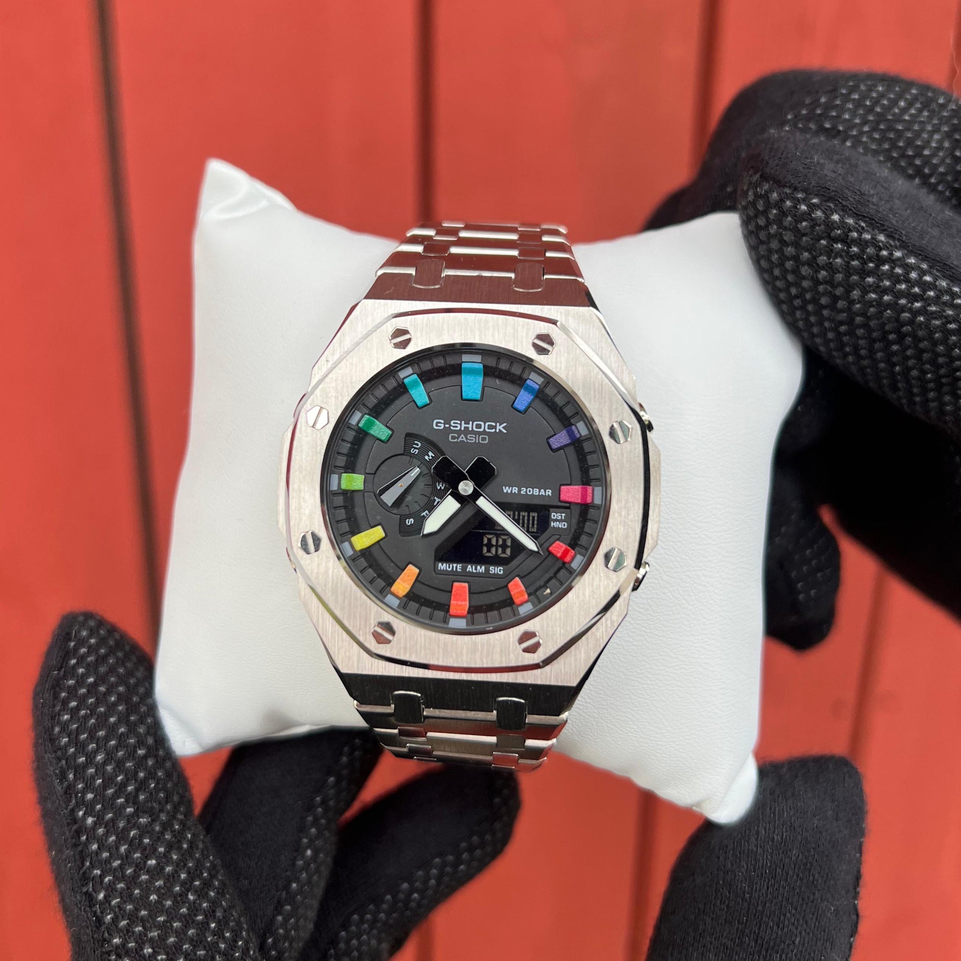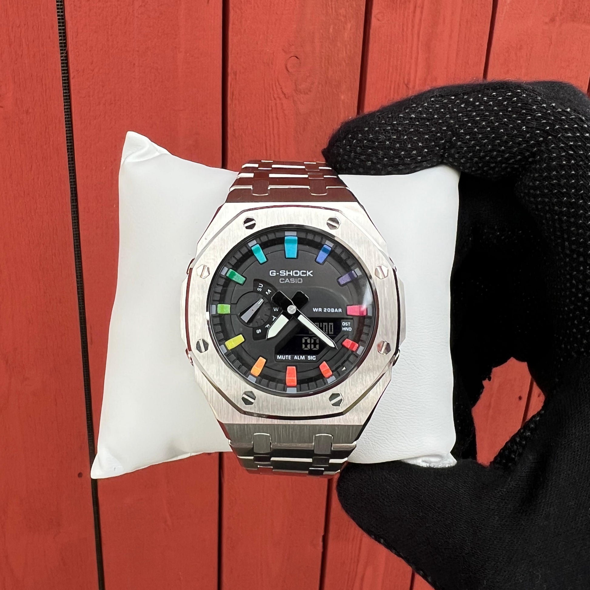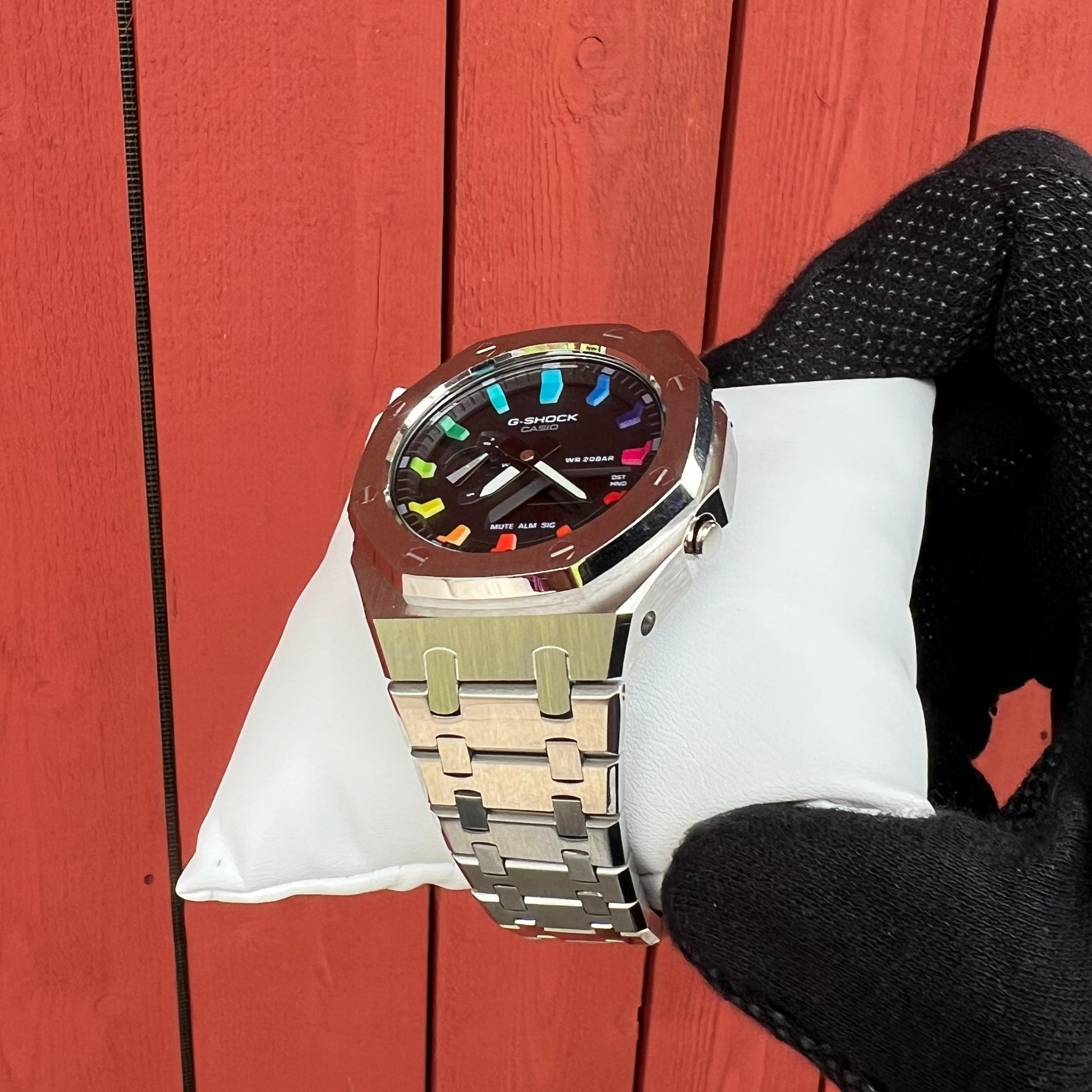 Durability meets style. This customized G-Shock blends tough performance with a refined metal finish and elegant crystal details, making it perfect for both everyday wear and standout moments.